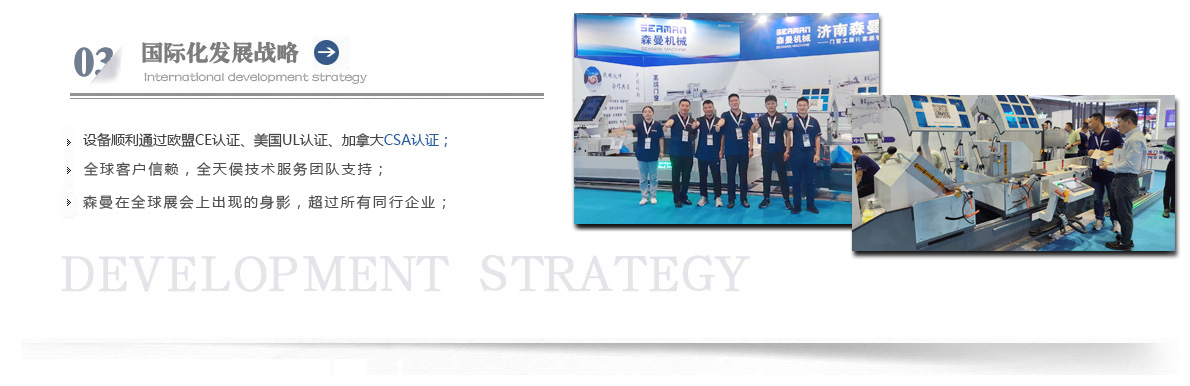“森曼機械”作為全球門窗設備供應商,本著"seaman"精神,勇立潮頭,拼搏創新,以爭做行業為目標,在行業前輩發展的基礎上,努力學習,積極進取。目前公司產品涵蓋塑料門窗設備、鋁合金門窗設備、鋁幕墻設備、鋁木復合門窗設備及中空玻璃設備五大種類,近百個品種。公司產品銷售至全國各地及東南亞、非洲、東歐、北美等幾十個國家和地區。在這個競爭激烈的年代,我們正努力使我們的產品!